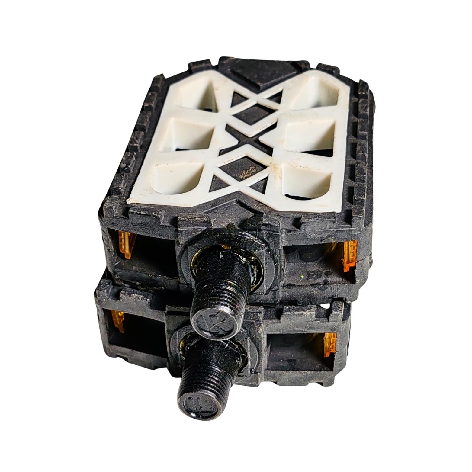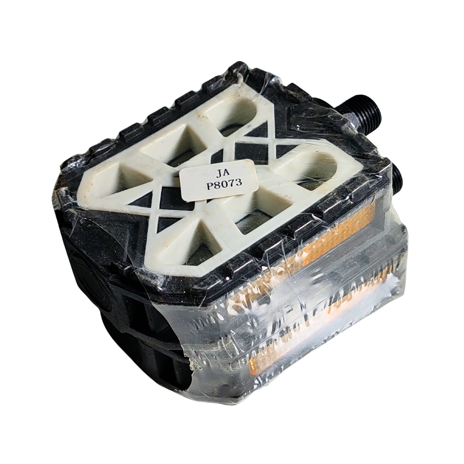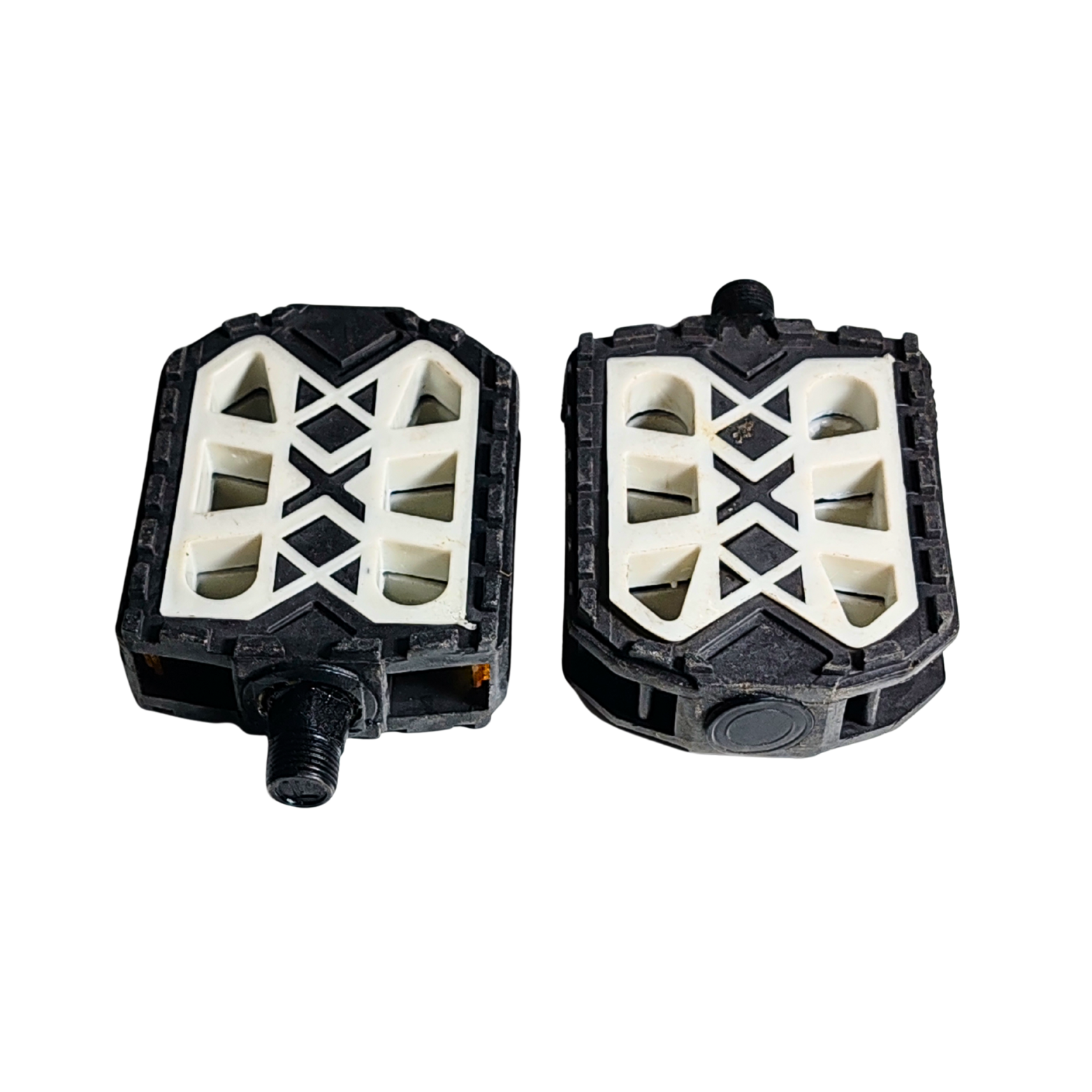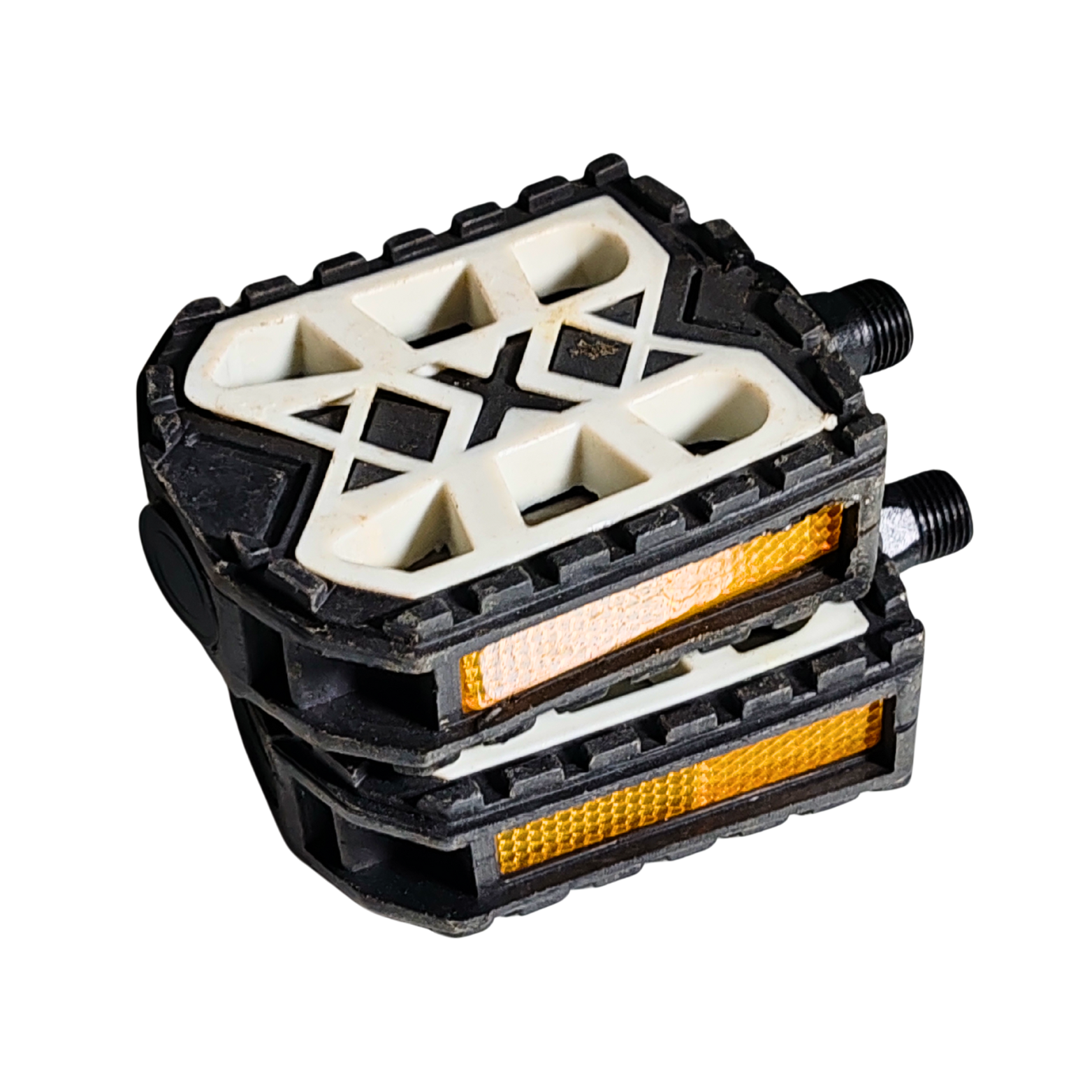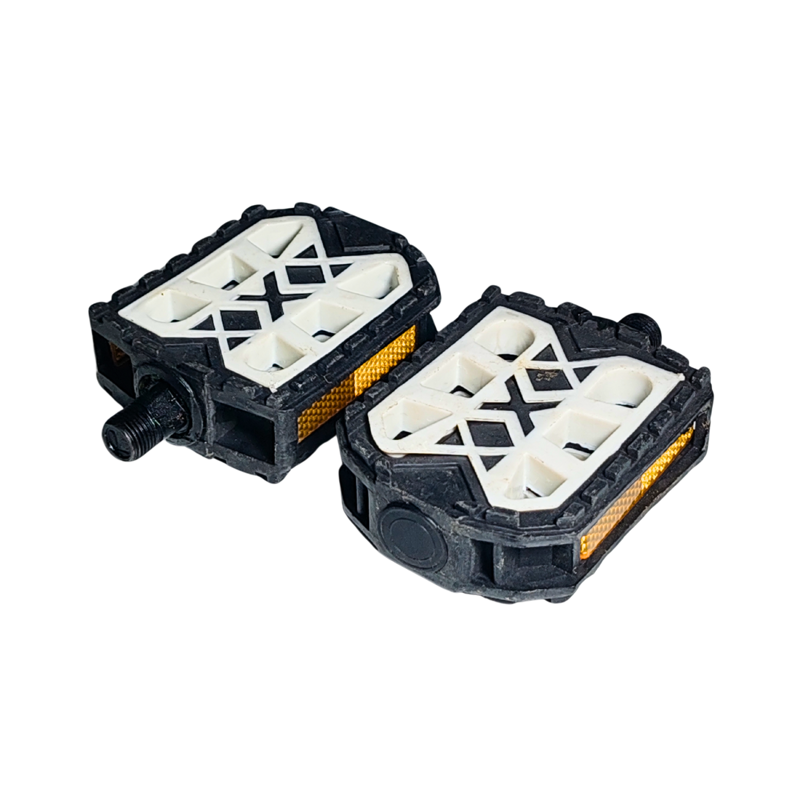 Pedal de bicicleta blanco con negro, con franja luminosa, de plástico duro.